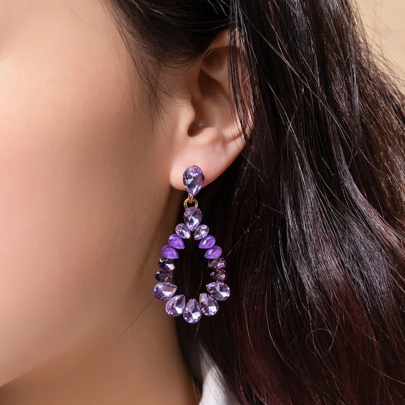 Aretes con diseño de óvalo con cristales de colores al rededor de todo el modelo. Elegantes y livianos, sus cristales brillan con el movimiento y la luz.